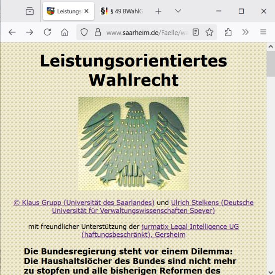 Der Fall gehört zu den Saarheim-Fällen, die in einer Bundesrepublik spielen, in der es ähnlich zugeht, wie in der Weimarer Republik (was in den 2000ern, aus der den Fall stammt, kaum vorstellbar war, heute aber zunehmend wieder real zu werden droht). Die Fallgeschichte dieses Falles ist jedenfalls durch den sog. "Preußenschlag" inspiriert worden (hierzu http://de.wikipedia.org/wiki/Preußenschlag) unterscheidet sich jedoch hiervon in wesentlichen Elementen. Jedoch kann es nichts schaden, sich bei Gelegenheit dieser Fallbearbeitung auch einmal mit diesem Aspekt deutscher (Verfassungs-)Geschichte zu befassen. Insoweit kann ganz zunächst auf StGH, 15/32 v. 25.7.1932 in: RGZ 137, Anh. 65 ff. und StGH, 15,16, 17, u. 19/32 v. 10./14. und 17.10.1932, in: RGZ 138, Anh. 1 ff. und ganz allgemein auf unsere Sammlung interessanter Entscheidungen des Reichsgerichts und des Staatsgerichtshofs für das Deutsche Reich zum Verfassungsrecht und Verfassungsprozessrecht hingewiesen werden. Zur Aktualisierung waren in diesen Fall - wie in allen anderen Saarheimer Staatsrechtsfällen - die Nummerierungs-Änderungen der Art. 93 und Art. 94 durch das Gesetz zu Änderung des Grundgesetzes (Art. 93 und 94) vom 20.12.2024 (BGBl. 2024 I Nr. 440) einzuarbeiten gewesen. Der bisherige Regelungsinhalt des Art. 93 Abs. 1 bis 3 a. F. GG wurde hierduch weitgehend wortgleich zum Regelungsinhalt des Art. 94 Abs. 1 bis 3 n. F. GG, ferner wurde der Regelungsinhalt des Art. 94 Abs. 2 a. F. GG ("Ein Bundesgesetz regelt seine Verfassung und das Verfahren und bestimmt, in welchen Fällen seine Entscheidungen Gesetzeskraft haben. Es kann für Verfassungsbeschwerden die vorherige Erschöpfung des Rechtsweges zur Voraussetzung machen und ein besonderes Annahmeverfahren vorsehen") wortgleich in Art. 93 Abs. 5 n. F. GG überführt. In der Literatur und Rechtsprechung aus der Zeit vor Inkrafttreten dieses verfassungsändernden Gesetzes sind diese Umnummerierungen naturgemäß noch nicht berücksichtigt, jedoch kann angenommen werden, dass sich die insoweit zu den alten Fassungen dieser Bestimmungen getroffenen Aussagen unverändert auf ihre neuen Fassungen übertragen lassen. Ferner wurden in diese Falllösung eine Reihe neuerer Entscheidungen des BVerfG aus den Jahren 2023 und 2024 eingearbeitet (u. a. BVerfG, 2 BvB 1/19 v. 23.1.2024 zum Finanzierungsausschluss NPD/Die Heimat), ohne dass insoweit aber etwas besonders hervorzuheben wäre.  |